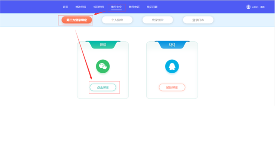 此时则需要用户,先通过普通登录(输入用户名、 密码 、 验证码),进入到安全中心 -> 帐号安全 -> 第三方登录绑定-> 微信 -> 点击绑定。