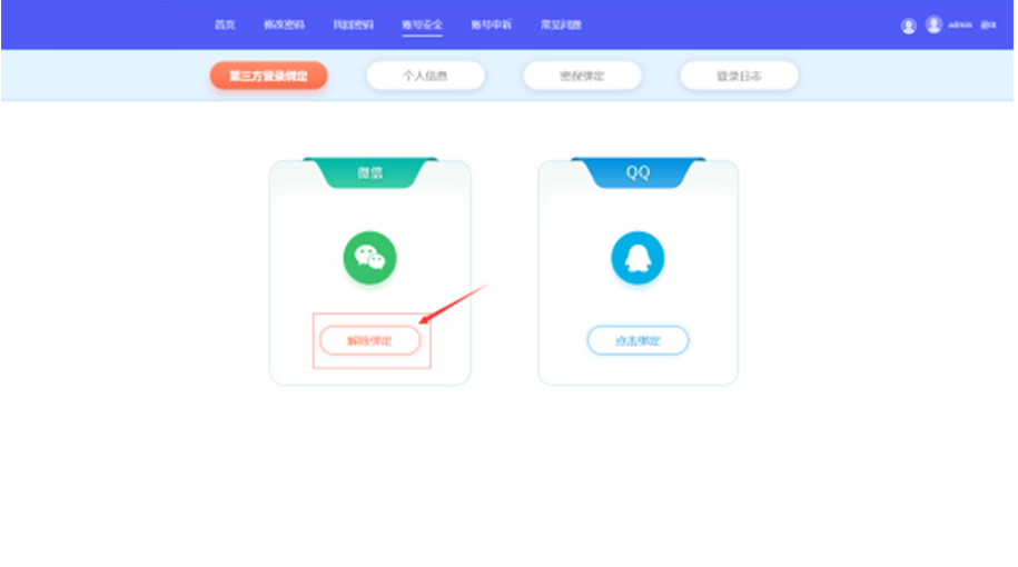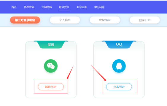 微信或QQ绑定成功之后,可以通过点击解除绑定后则绑定失效。