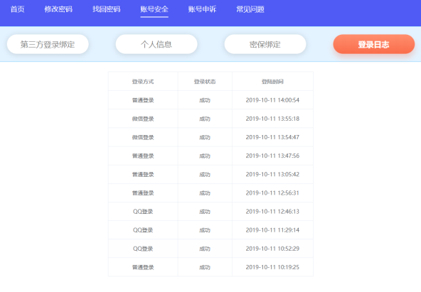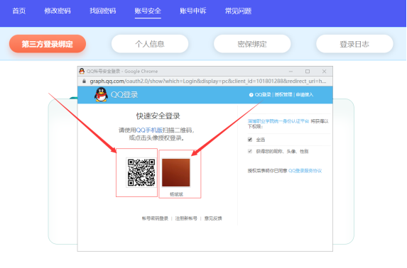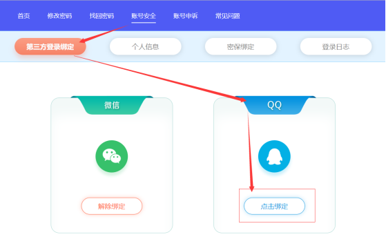 此时则需要用户通过普通登录(输入用户名、密码、 验证码)进入到安全中心 -> 帐号安全 -> 第三方登录绑定 -> QQ-> 点击绑定。
