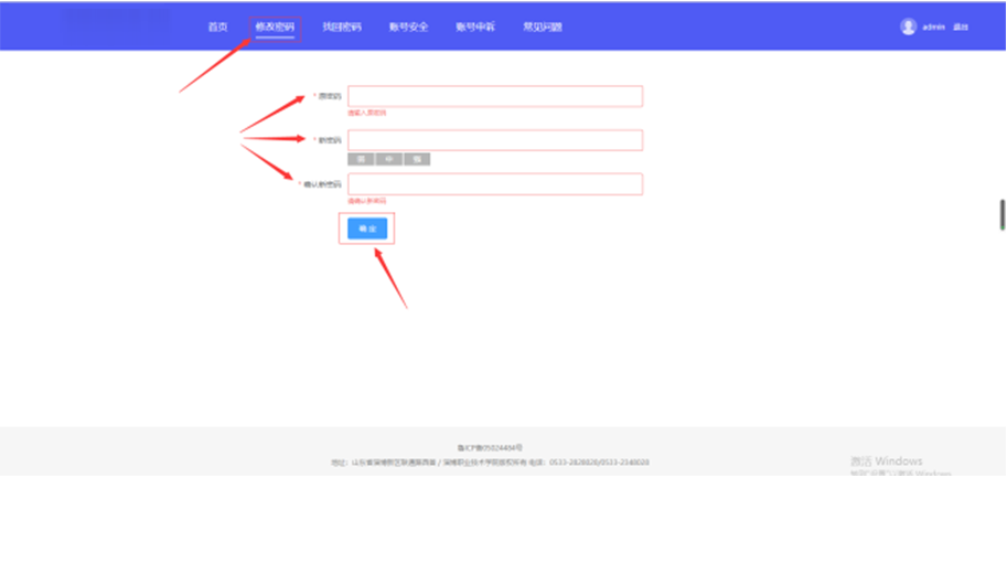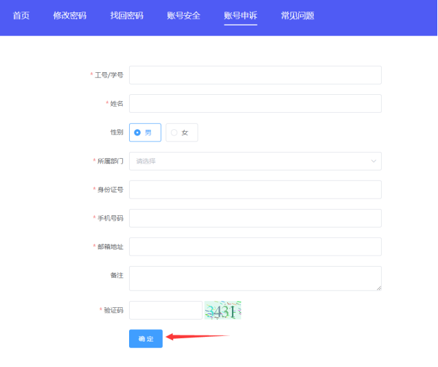账号申诉页面中,用户需要依次输入对应的个人信息,然后点击确认, 此时用户的申诉信息会被提交到管理员那里, 再通过管理员审核, 审核通过后用户会被重置密码,默认重置密码是身份证后六位。