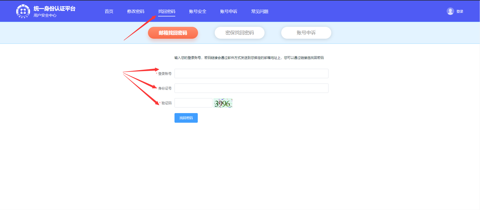 用户需输入登录账号,身份证号, 验证码然后点击找回密码, 此时系统会向用户绑定的邮箱发送链接, 用户在邮箱中点击链接重置密码。