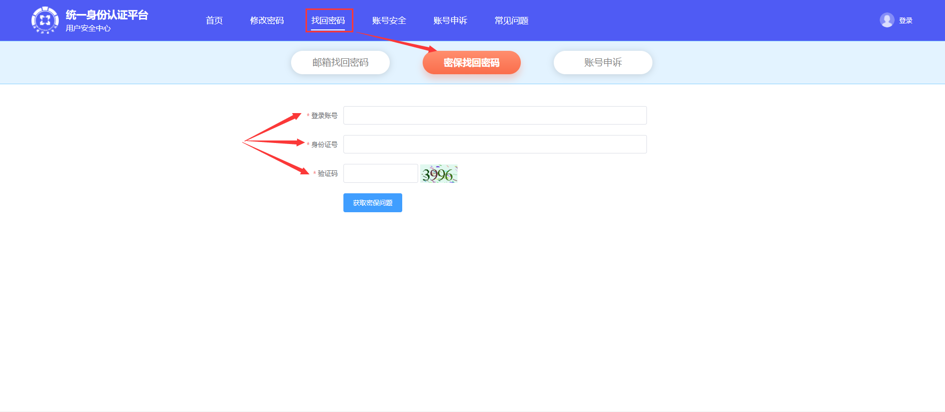 用户需要输入登录账号, 身份证号, 验证码然后点击获取密保问题。