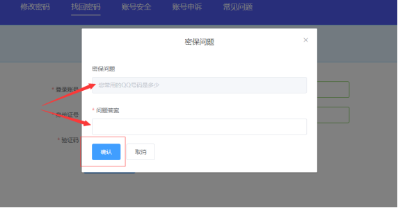 点击获取密保问题后,就会弹出用户先前绑定的密保问题, 此时需要输入用户自己之前设置的密保答案。