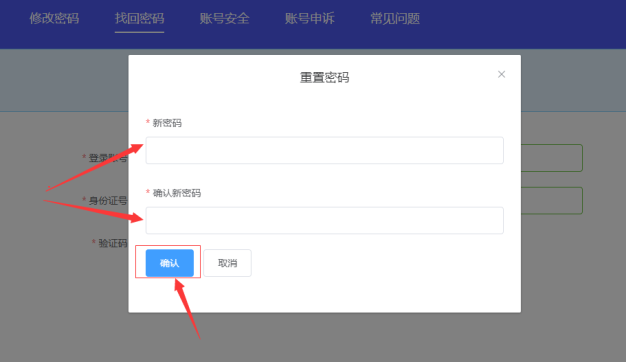 输入密保答案后, 点击确认, 如果答案正确则会显示重置密码的弹框。