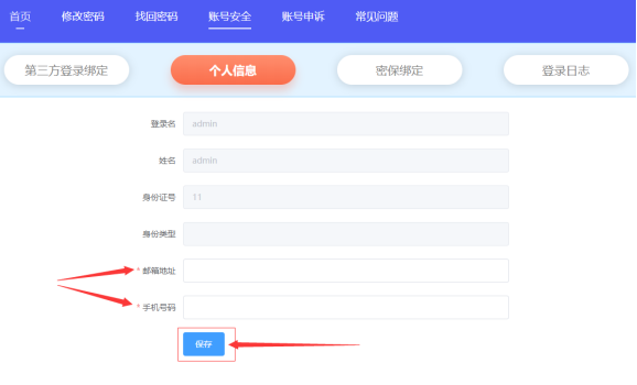 个人信息页面,用户只能修改邮箱和手机号码这两个信息,修改之后点击保存。