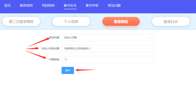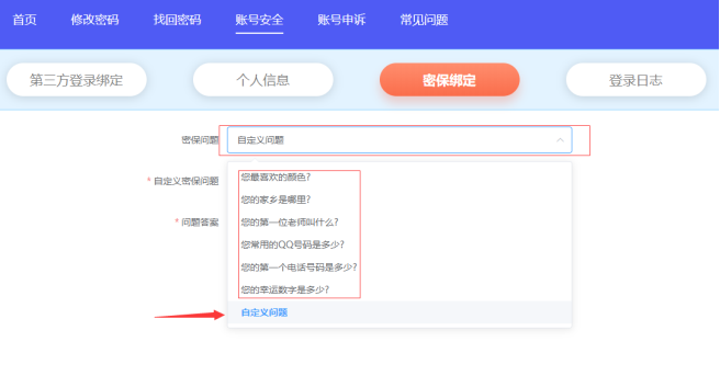 如果未绑定或想重新绑定,用户则可以点击密保问题的下拉框,会有几个默认问题供用户选择;用户也可以自定义密保问题、输入问题及密保答案完成密保绑定。